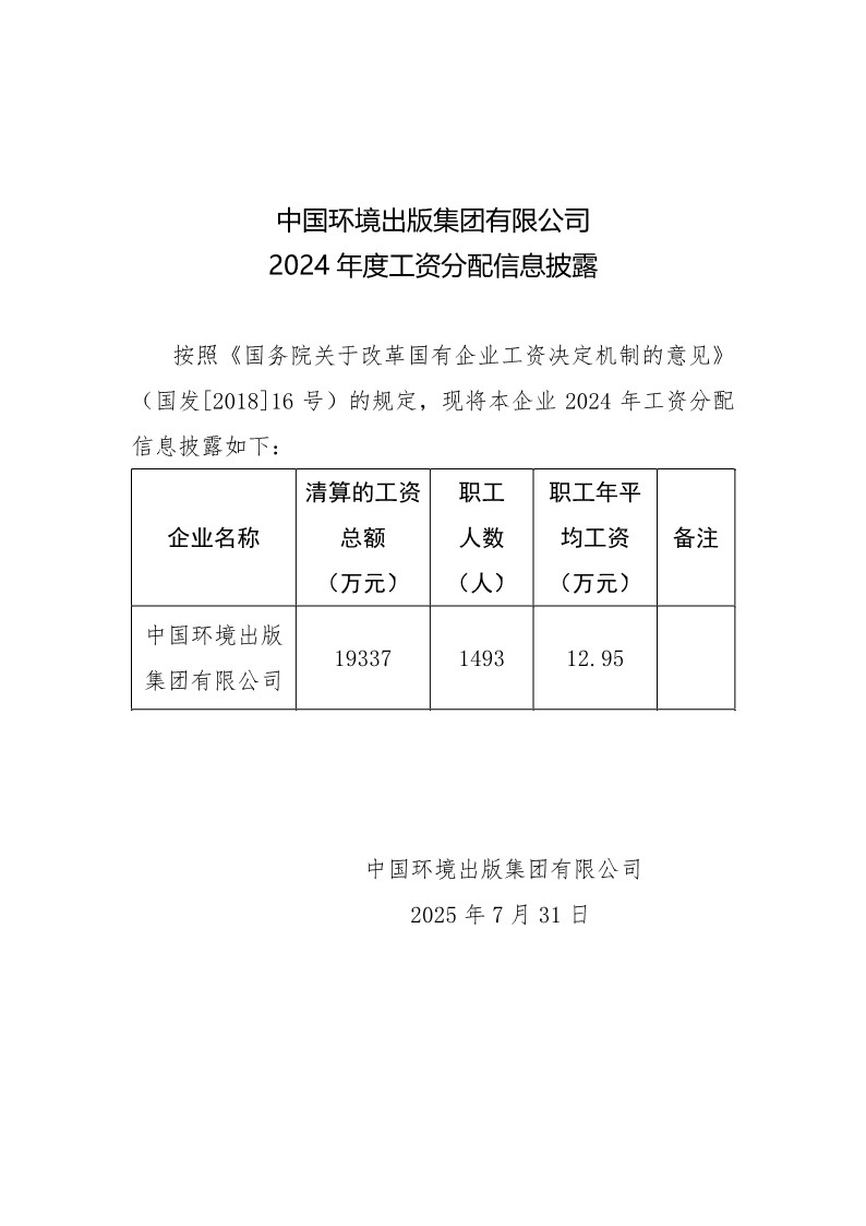 中國(guó)環(huán)境出版集團(tuán)有限公司2024年工資分配信息披露